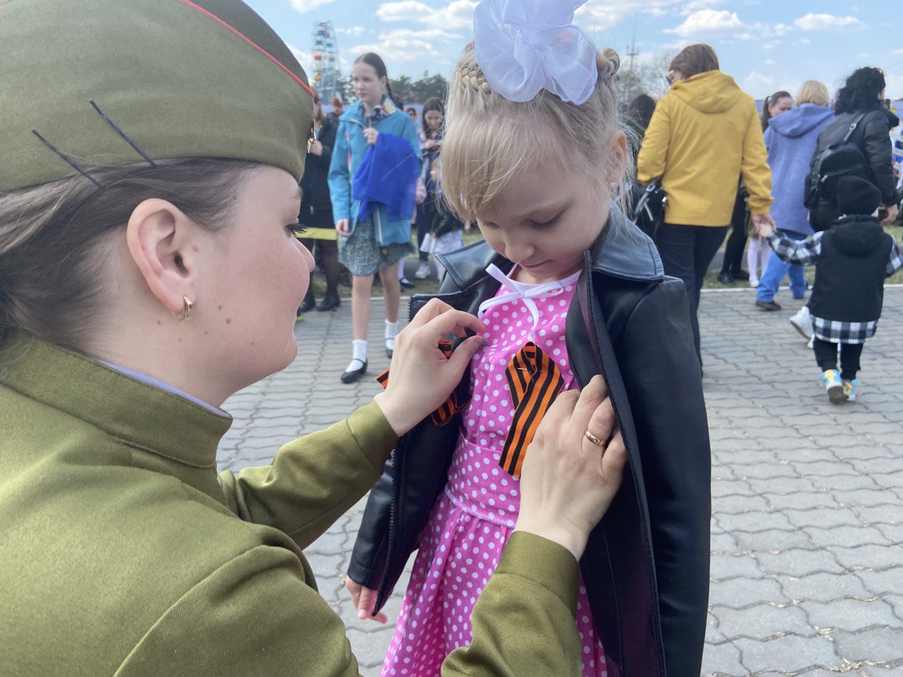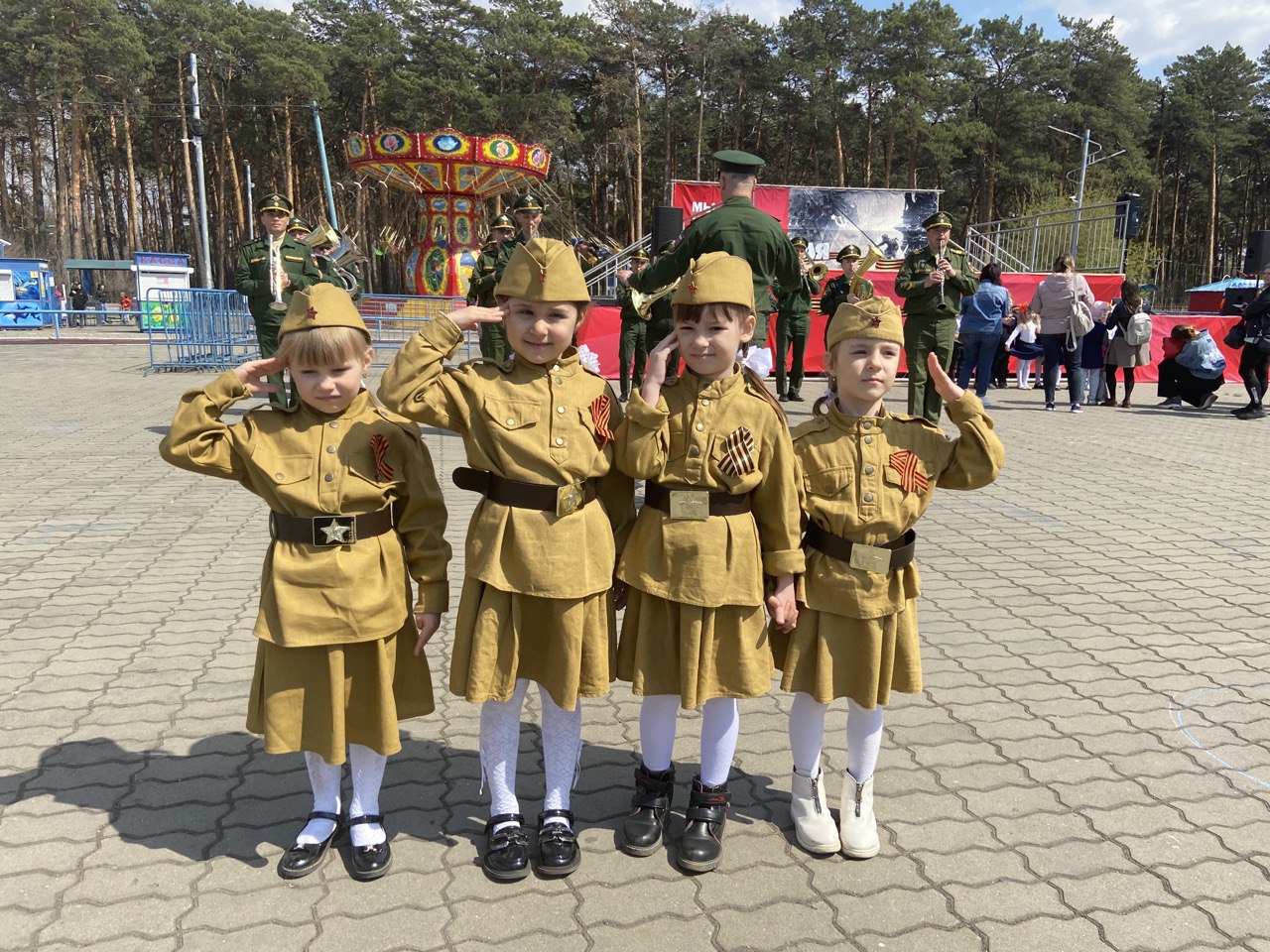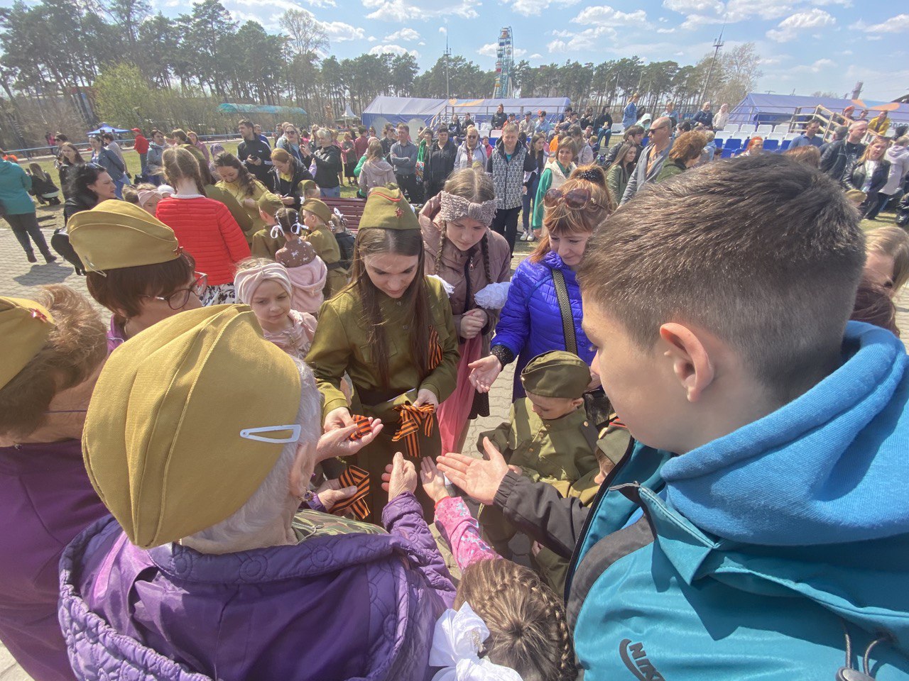 Перед началом акции "Вальс Победы " своими музыкальными военными композициями белогорцев порадовал военный духовой оркестр 165-й артиллерийской бригады. Также зрителям вручили три сотни лент-символов в рамках акции "Георгиевская ленточка".